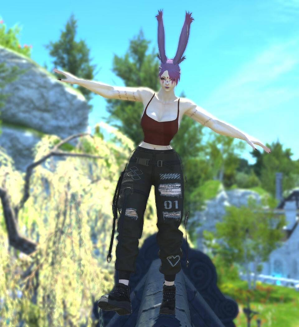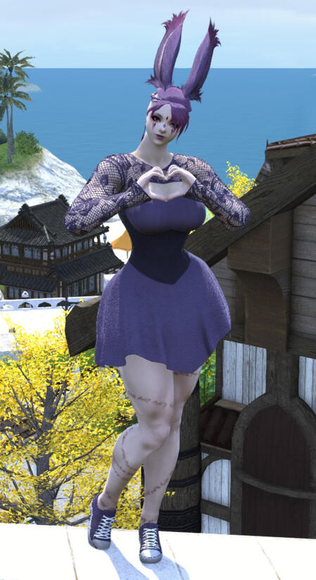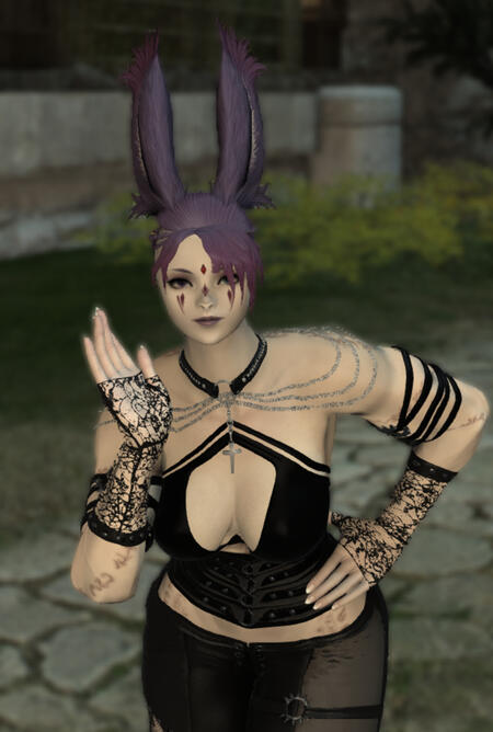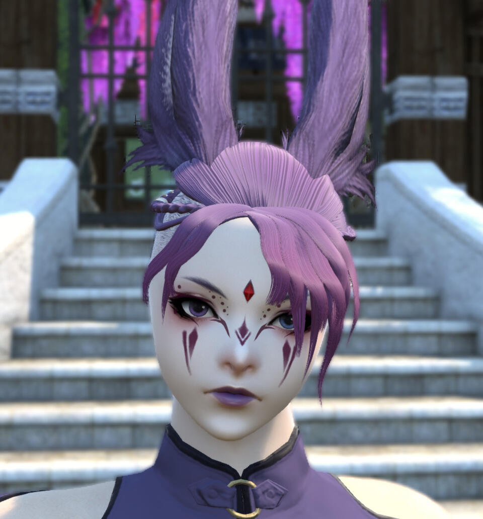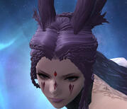 (WIP) Cota stands taller than your average female Viera. If you can't tell from her clothing, her hair is a giveaway for her love of the colour purple, with a dash of some form of red. If her jewel on her forehead doesn't first grasp your attention when first looking at her face, the single violet eye will. She uses her fair skin to show off a multitude of different outfits, and if skins showing, the scaring across her arms, legs, front and back will definitely be a conversation starter for its unique form.